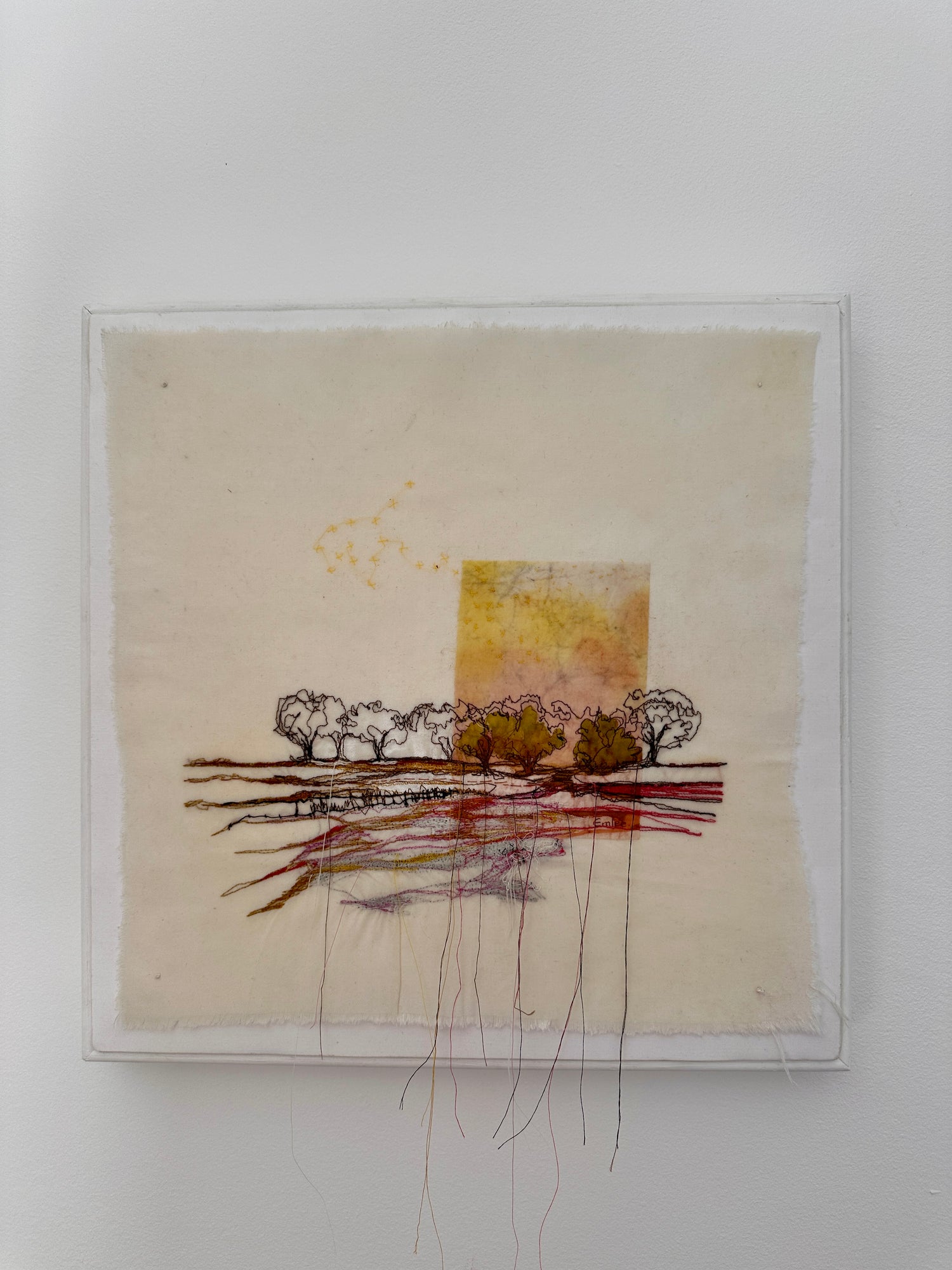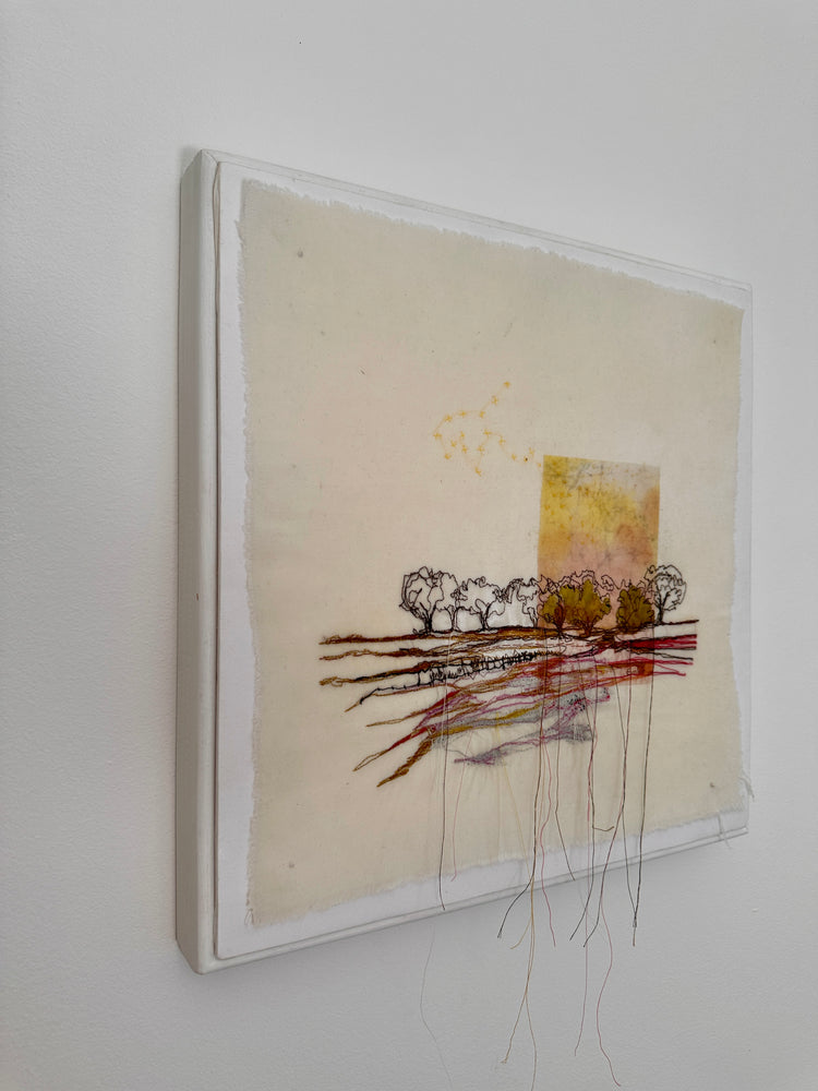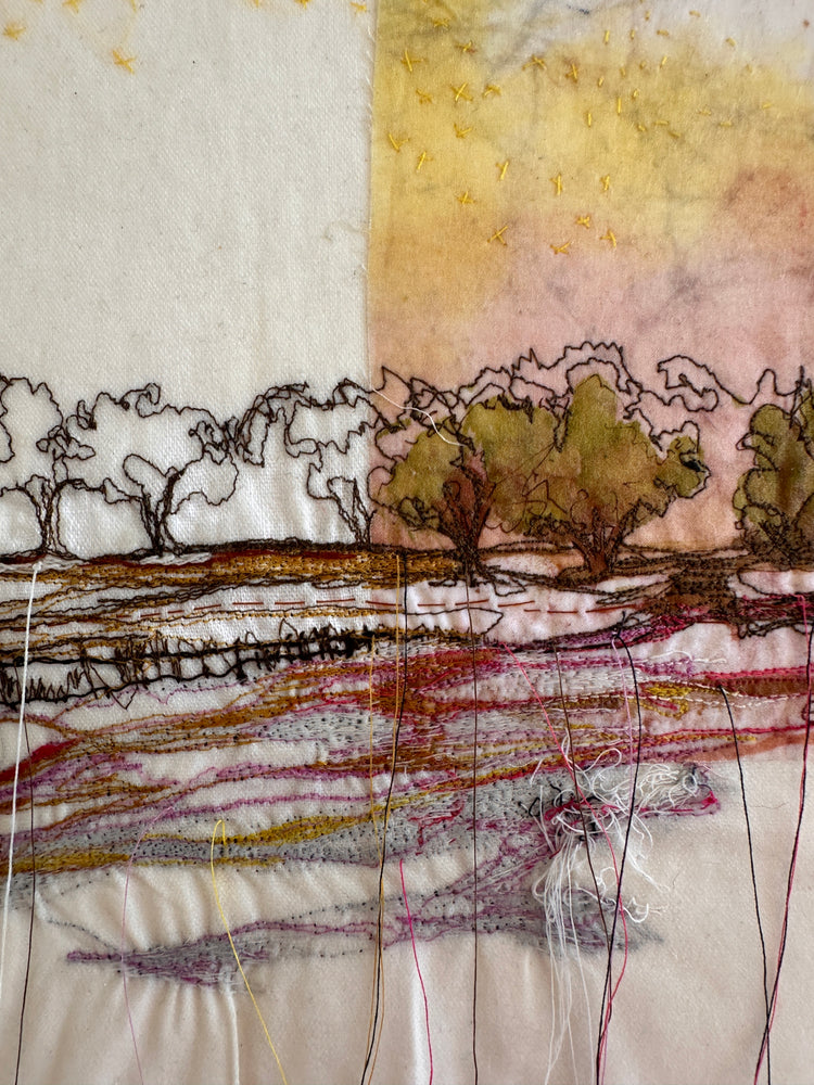 Across the Field began as one of my mother’s batik pieces—a cloth already full of warmth, color, and memory. I stitched over her work, adding new layers of thread and story. The golden tones suggest sunlight over a quiet field, with trees shimmering at the edge. Hand and machine embroidery intertwine, blending two generations of making into one landscape. It’s a piece about connection, care, and the beauty of passing creativity from one pair of hands to another.